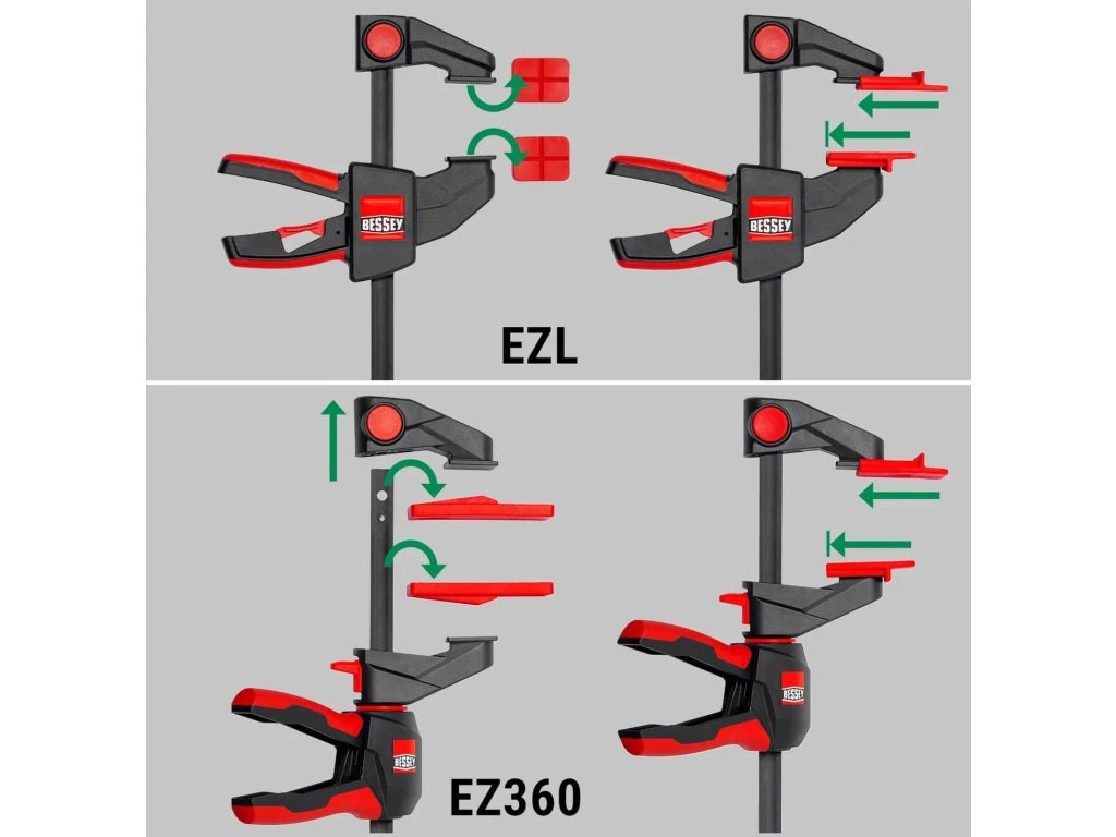 - Kompatibilita: jednoruční svěrky BESSEY EZ360 a EZL (od rozpětí 300 mm)