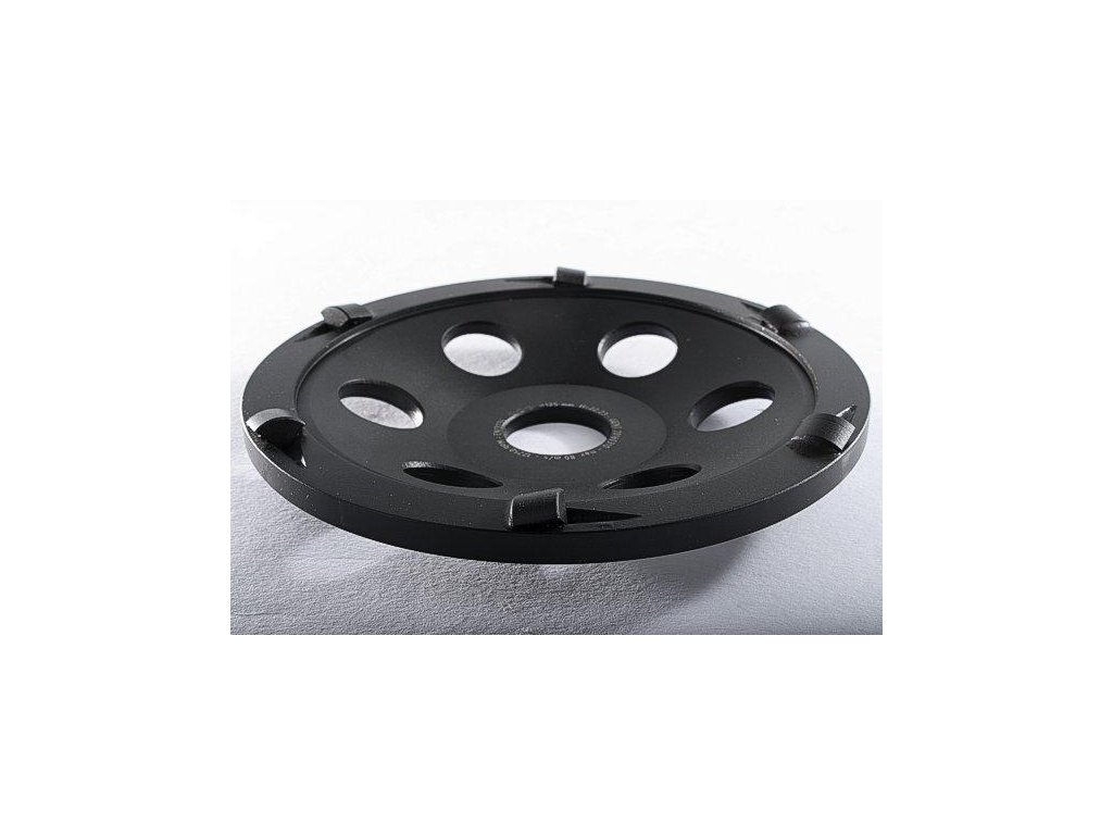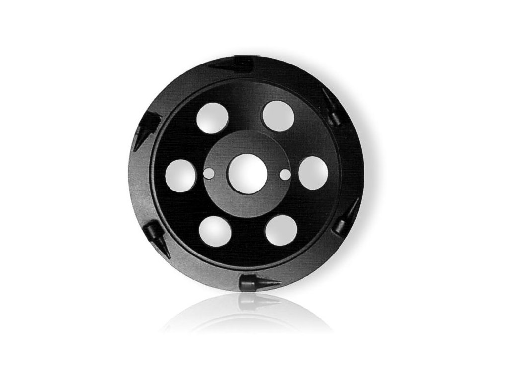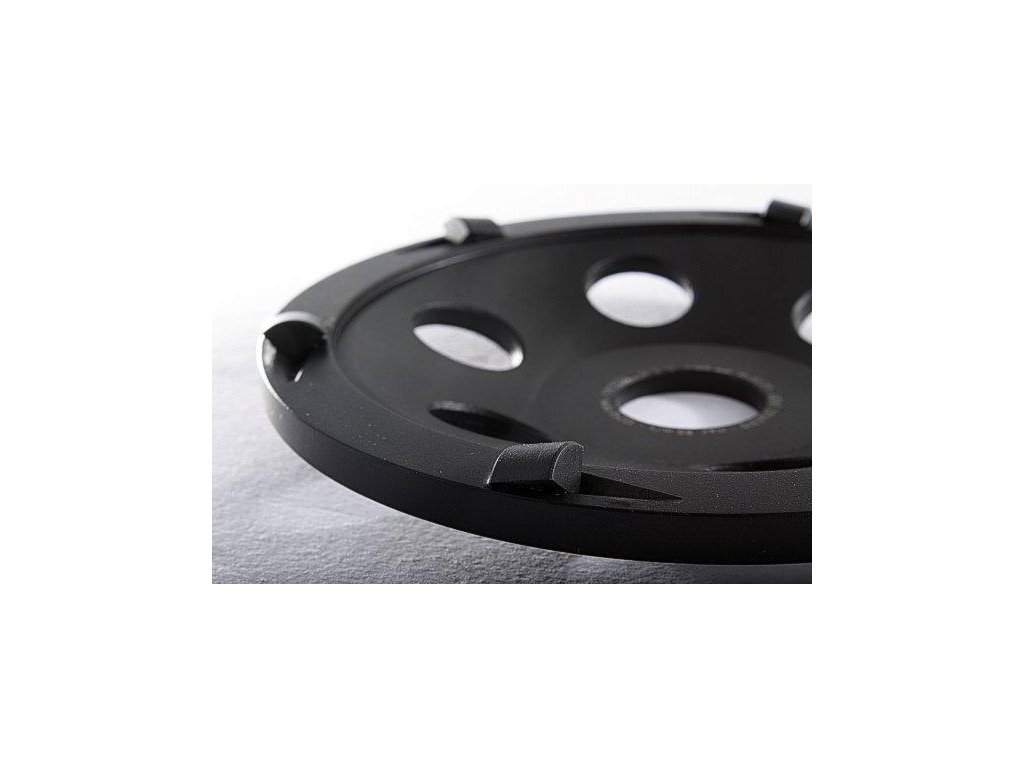 Kotouč je osazen masivními polykrystalickými diamanty PKD – jednotlivý segment tvoří ¼ diamantového válce o průměru 13 mm, což poskytuje mnohonásobně vyšší výkon než tradiční segmentované diamantové kotouče. PKD segmenty se nezanáší, nelepí a umožňují velmi agresivní, rychlé a kontinuální odebírání materiálu, zejména tam, kde se běžné nástroje okamžitě „zalepí“.