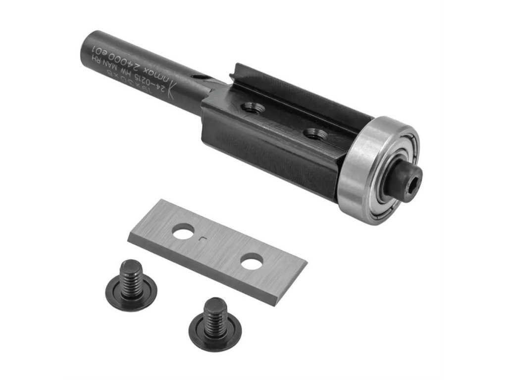 F043 je ořezávací fréza pro lícování přesahu a kopírování podle šablony zespodu – typicky: olepované hrany, lepené vrstvy, dílce vyřezané „na přídavek“ a dočištění na přesný tvar.