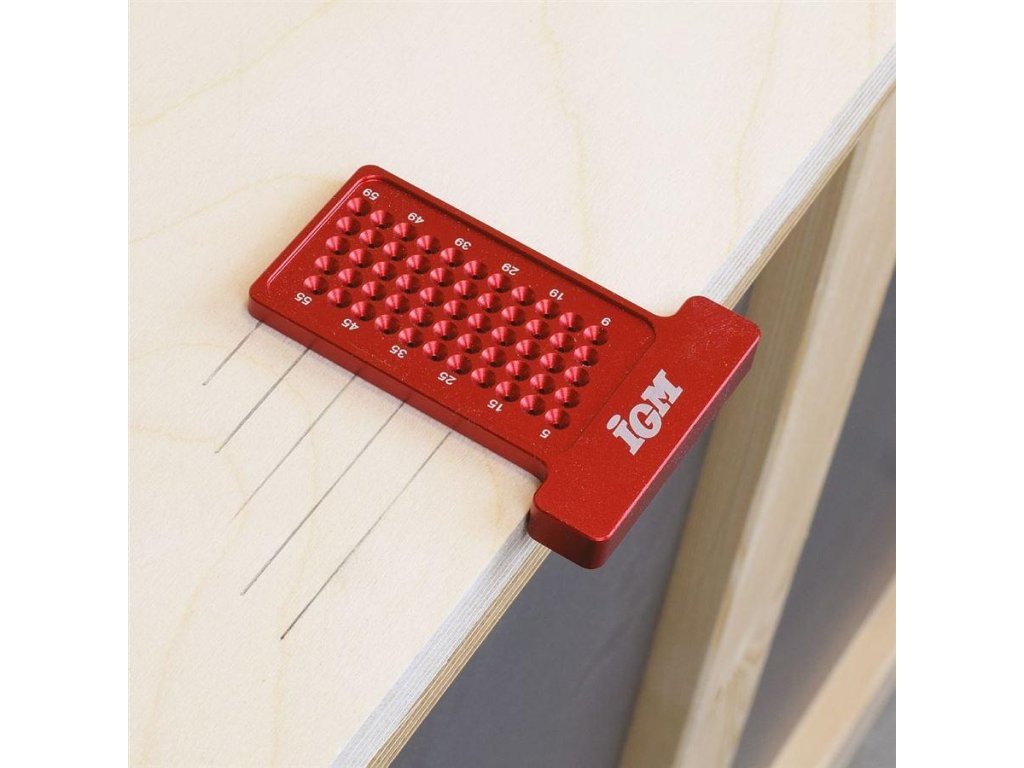 IGM Značicí příložník je praktický a přesný nástroj pro snadné rýsování rovnoběžných čar i pravých úhlů. Díky značícím otvorům po 1 mm lze přesně přenášet měření a rýsovat rovnoběžné čáry jednoduše posouváním příložníku po hraně materiálu.