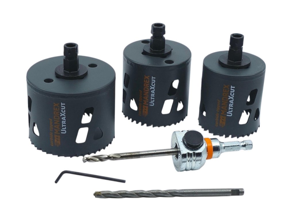 Sada Mandrex UltraXcut TCT s průměry 60, 68 a 83 mm představuje profesionální řešení pro přesné a čisté vrtání do široké škály materiálů. Korunky řady UltraXcut jsou vybaveny CNC broušenými karbidovými zuby z jemnozrnného tvrdokovu, které poskytují čistý řez, vysokou rychlost práce a dlouhou životnost.