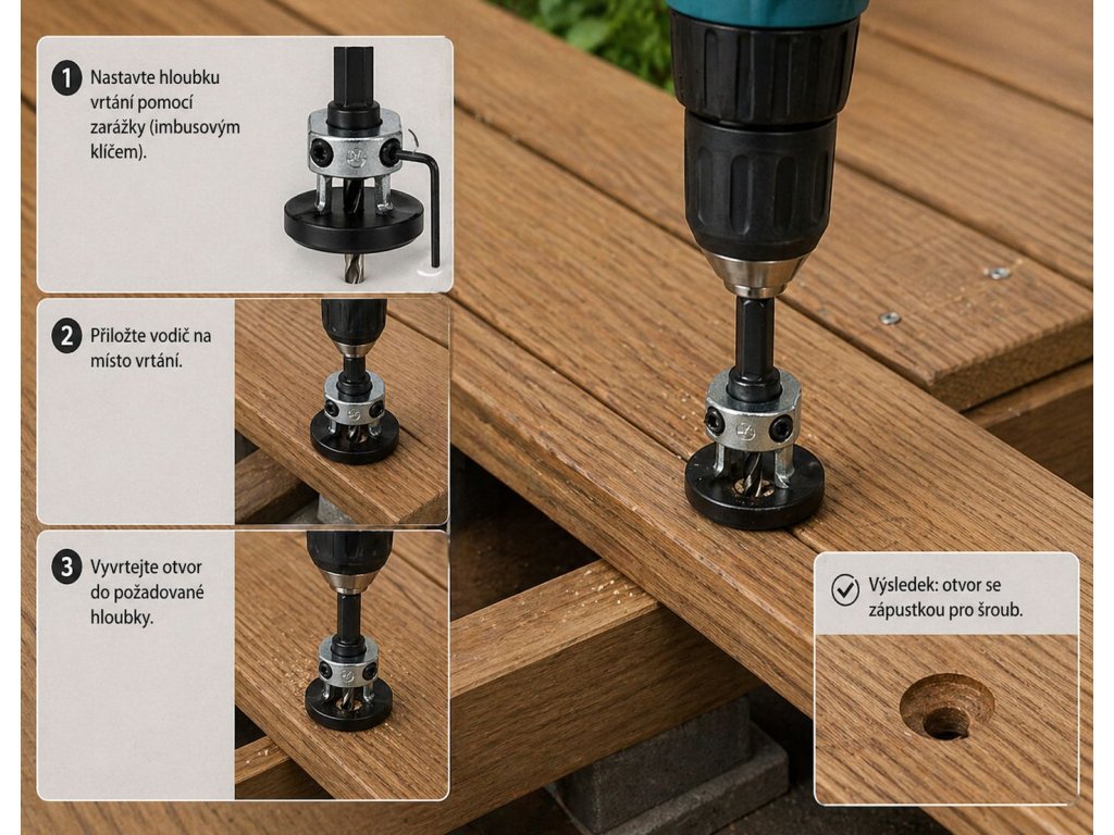 Když montujete terasu, plot nebo podlahu, nejvíc času se ztratí na opravách: jednou je vrut utopený, podruhé trčí, jinde se udělá kolem hlavy ošklivý kroužek. Tenhle předvrtávák řeší výsledek práce v jednom kroku: předvrtá a zároveň zahloubí tak, aby hlava vrutu seděla přesně tam, kde ji chcete mít.