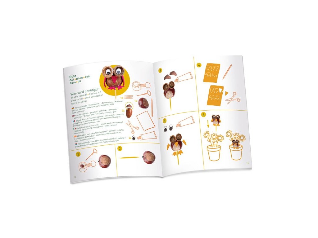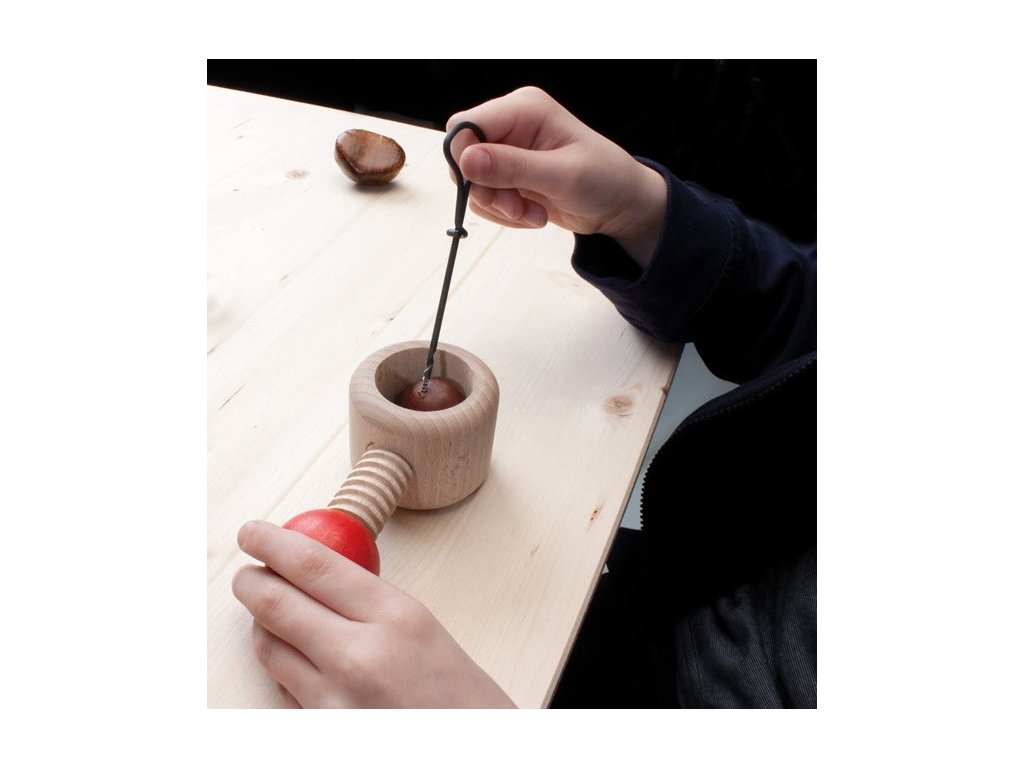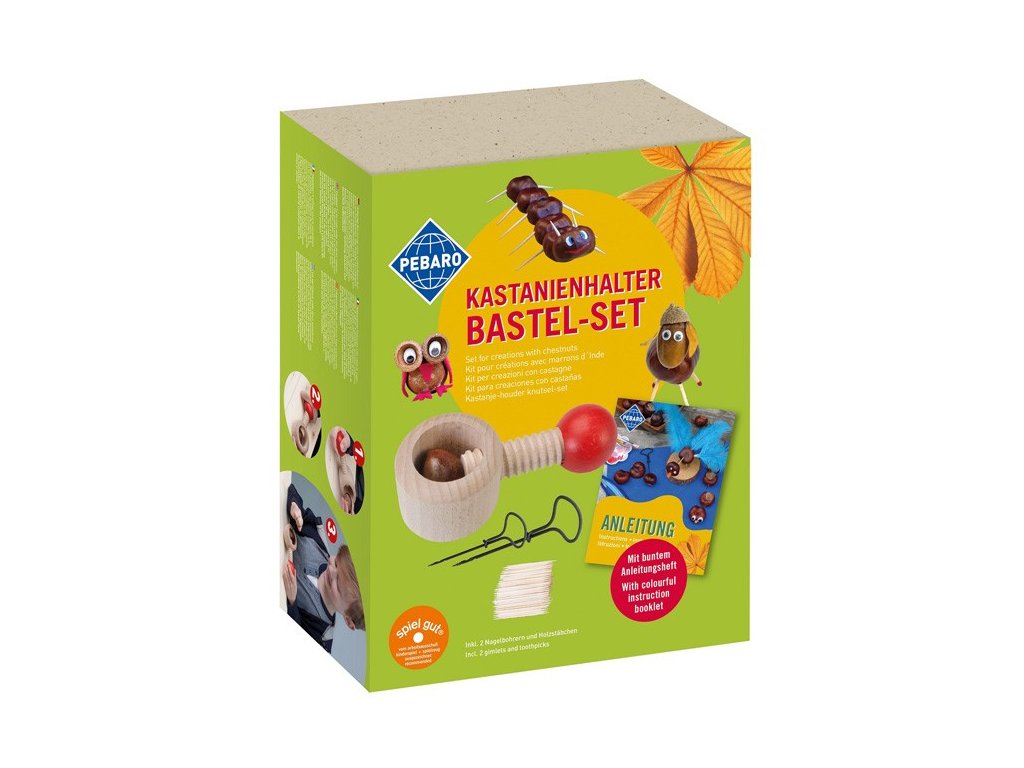 Obsahuje vše potřebné – držák na kaštany, dva vrtáky, párátka a ilustrovaný návod s nápady na výrobu figurek.