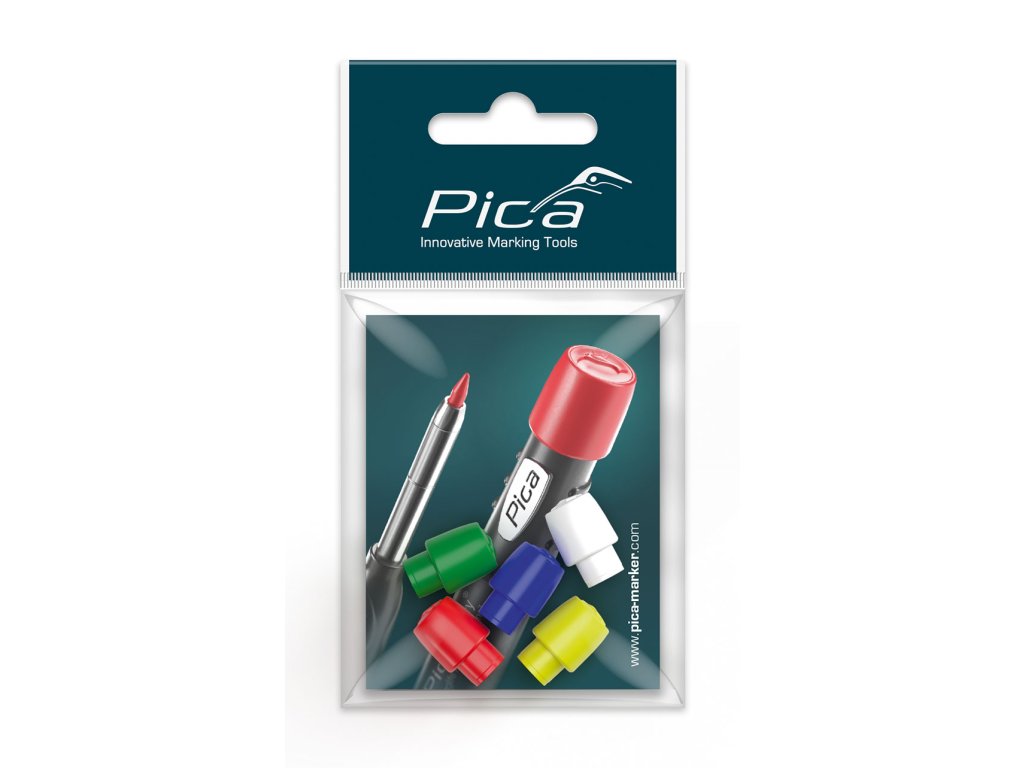 Čepičky ve 5 odlišných barvách se nasazují na Pica Dry 3030 a pomáhají rychle identifikovat typ náplně, tvrdost nebo účel tužky – například podle barvy kapsy v pracovních kalhotách nebo na pracovním stole.