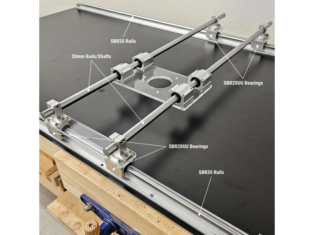 Po tyčích se pohybují čtyři lineární pojezdy s kuličkovými ložisky a prachotěsným těsněním (typ SBR20UU), které nesou saně s frézkou. Po správném seřízení je posuv plynulý, předvídatelný a bez vůlí.
