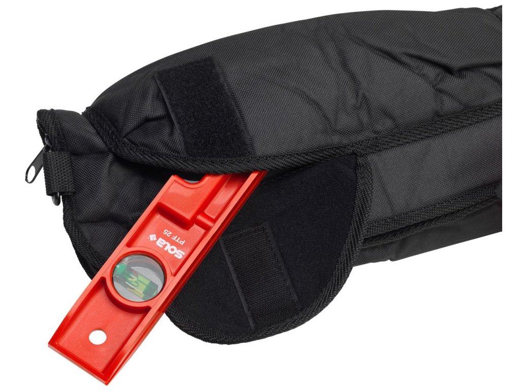 SOLA BAG PLUS je praktické ochranné pouzdro na vodováhy, které udrží vaše měřidla pohromadě a chráněná při převozu i skladování. Provedení „PLUS“ přidává boční kapsy – ideální na značkovače a další drobné měřicí pomůcky, které chcete mít vždy po ruce.