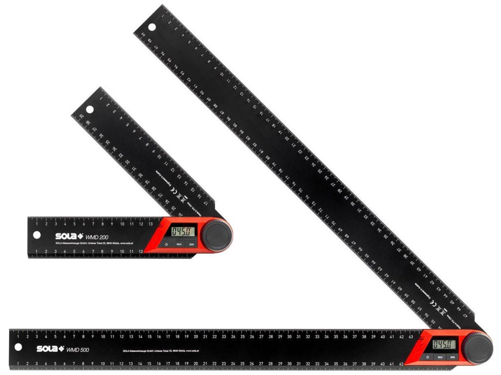 Digitální úhloměry WMD jsou dostupné ve dvou délkách: jako kompaktní provedení s délkou 200 mm (celkovou délkou 400 mm), a jako provedení s délkou 500 mm (celkovou délkou 1000 mm). Provedení s délkou 500 mm je vzhledem ke své dlouhé příložné ploše zvláště vhodné pro profesionální řemeslníky, např. pro zjišťování úhlů stěn a přemostění ubíhajících ploch v rozích.