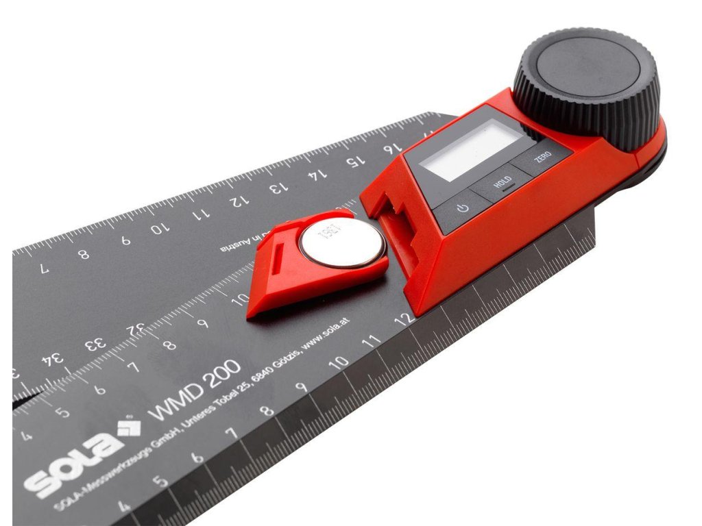 Modul digitálního úhloměru obsahuje knoflíkovou baterii CR2032. Přihrádka na baterii s dětskou pojistkou splňuje normu IEC 62368-1:2018 o bezpečnosti výrobku. Tak je nutné přihrádku na baterii současně otevírat dvěma prsty, aby bylo možné baterii vyměnit.