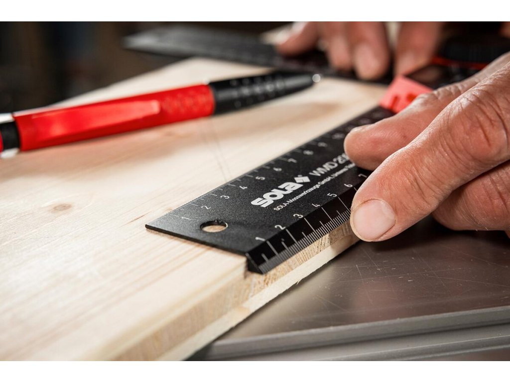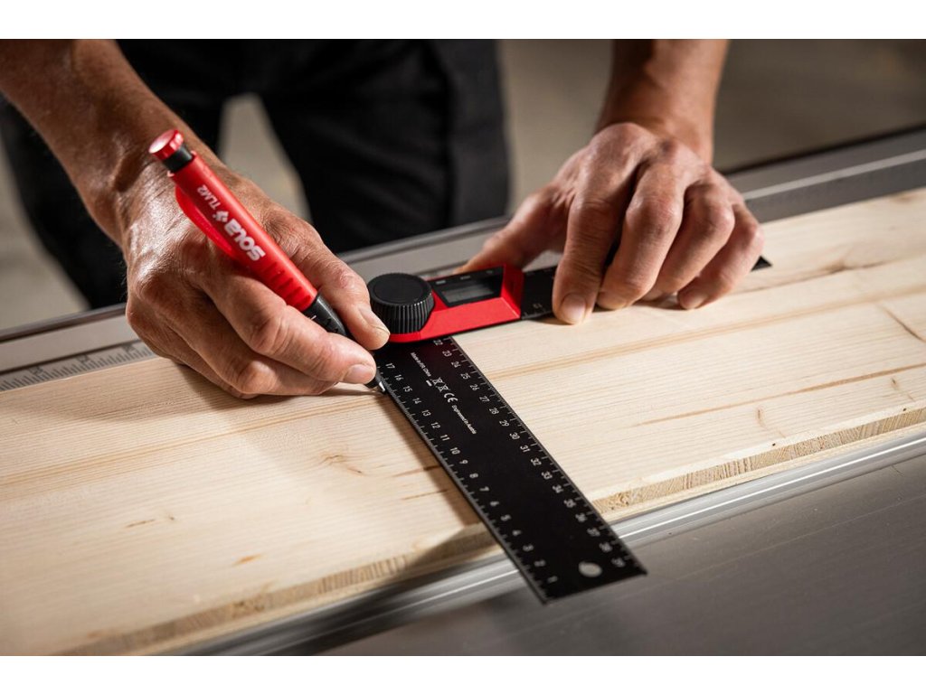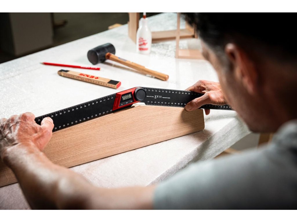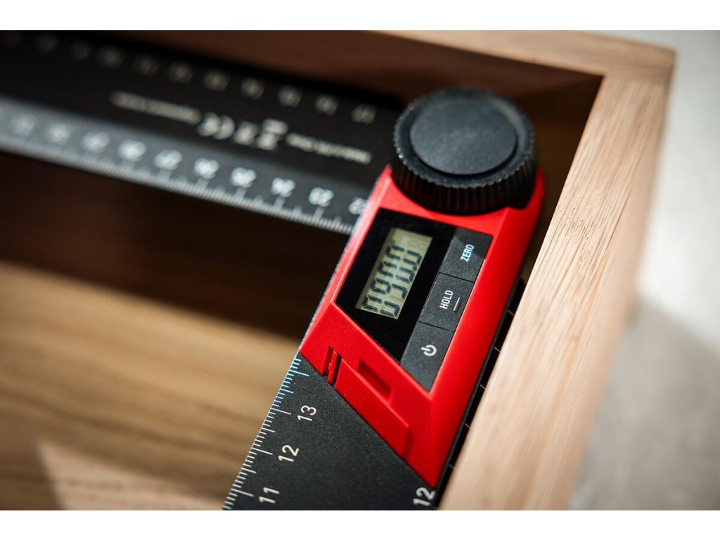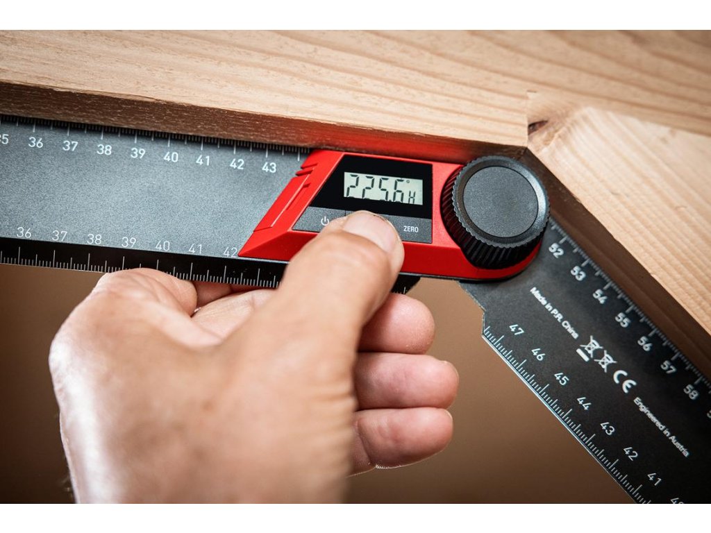 Pro lepší tuhost jsou hliníková ramena zesílena výztužnými žebry na spodní straně, což zabraňuje prohýbání ramen. Metrická stupnice na obou ramenech digitálního úhloměru disponuje vysokým kontrastem a lze ji proto velmi dobře odečítat. Tak lze přesně a spolehlivě provádět měření a minimalizovat tak chyby a nesrovnalosti.