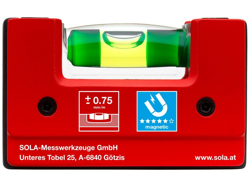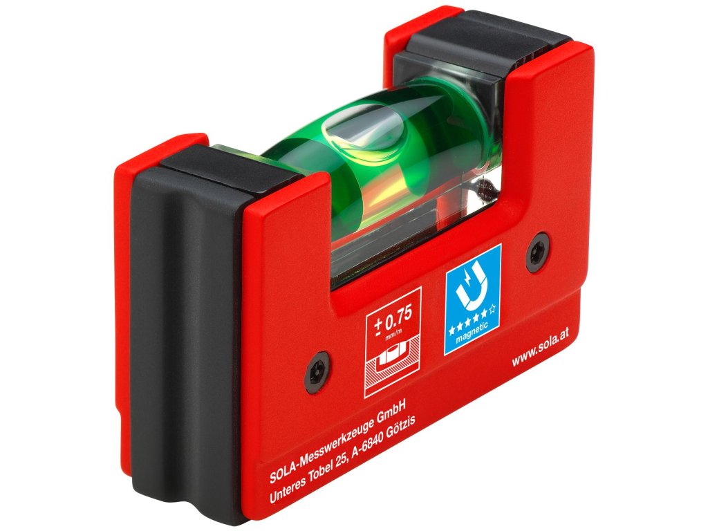 SOLA u této mini vodováhy používá libelu FOCUS se zvětšovací čočkou (+60 %) a vysokým kontrastem – odečet je rychlý i ve chvíli, kdy pracujete „na ruku“ a jen krátce kontrolujete bublinu. Výrobce uvádí také 30letou záruku na těsnost libely.