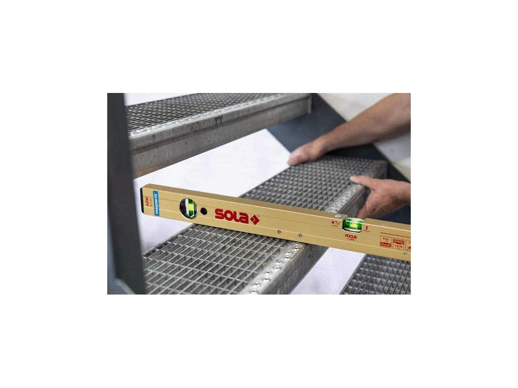 Magnetická vodováha SOLA AZM pro práci na oceli a profilech: neodymové magnety z boku (rovná měřicí plocha po celé délce), libely SOLA FOCUS pro rychlý odečet a přesnost 0,50 mm/m standardně a 0,75 mm/m obráceně.