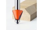 Na ořezávání a srážení hran pod úhlem 45°. Kopírovací ložisko vede frézu po hraně dílce, takže úkos drží stejný rozměr po celé délce.